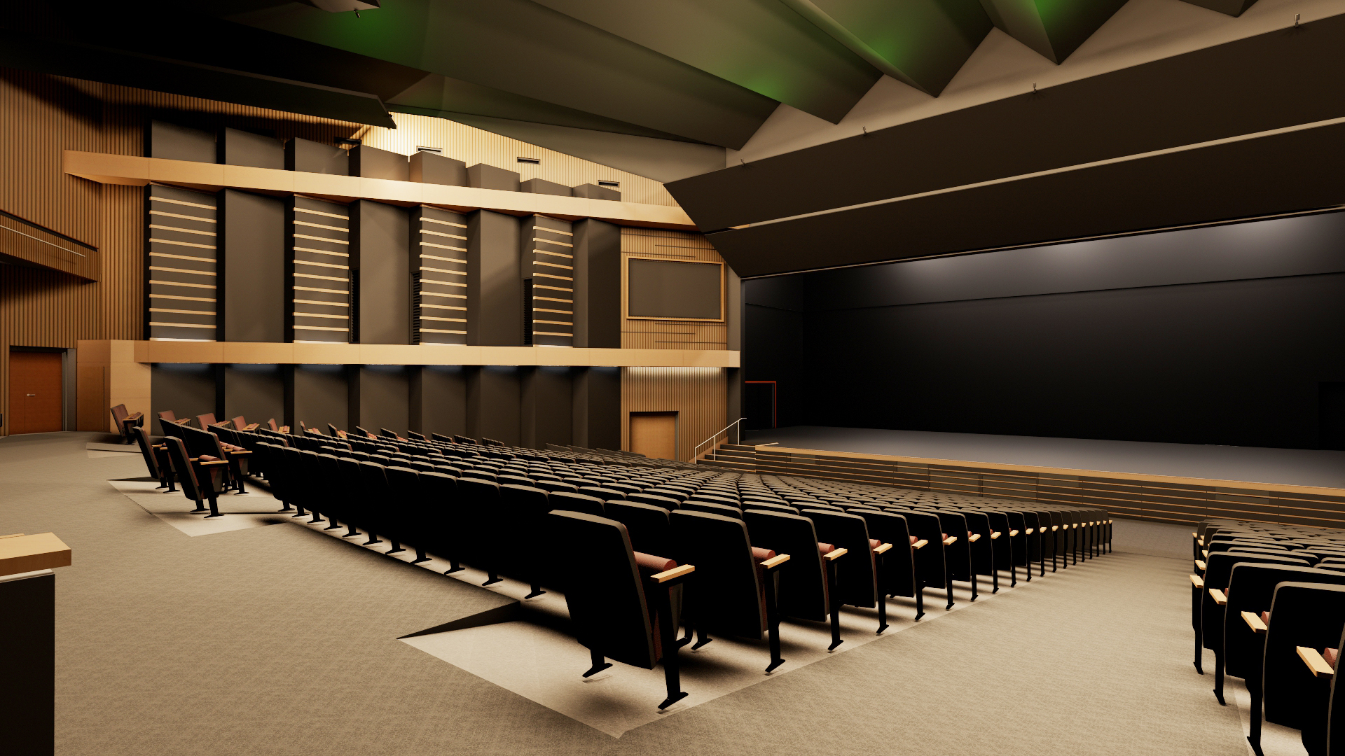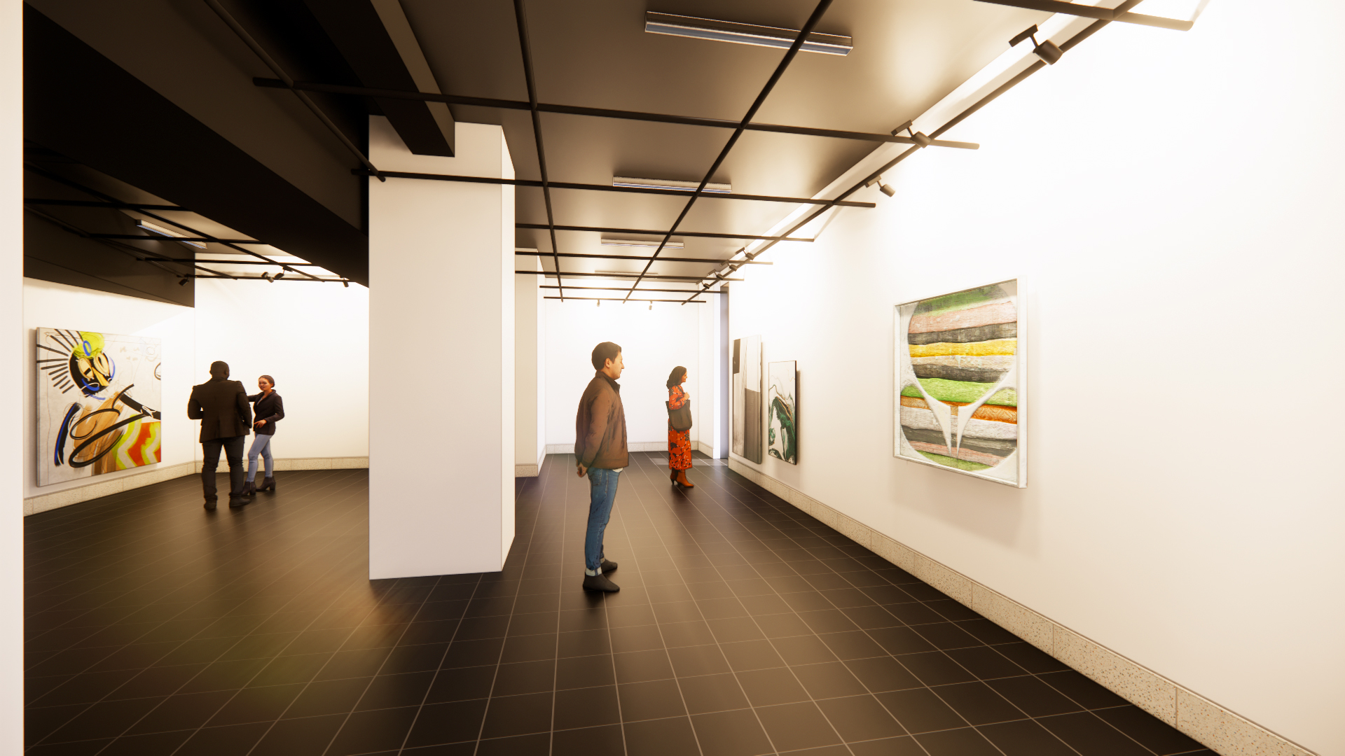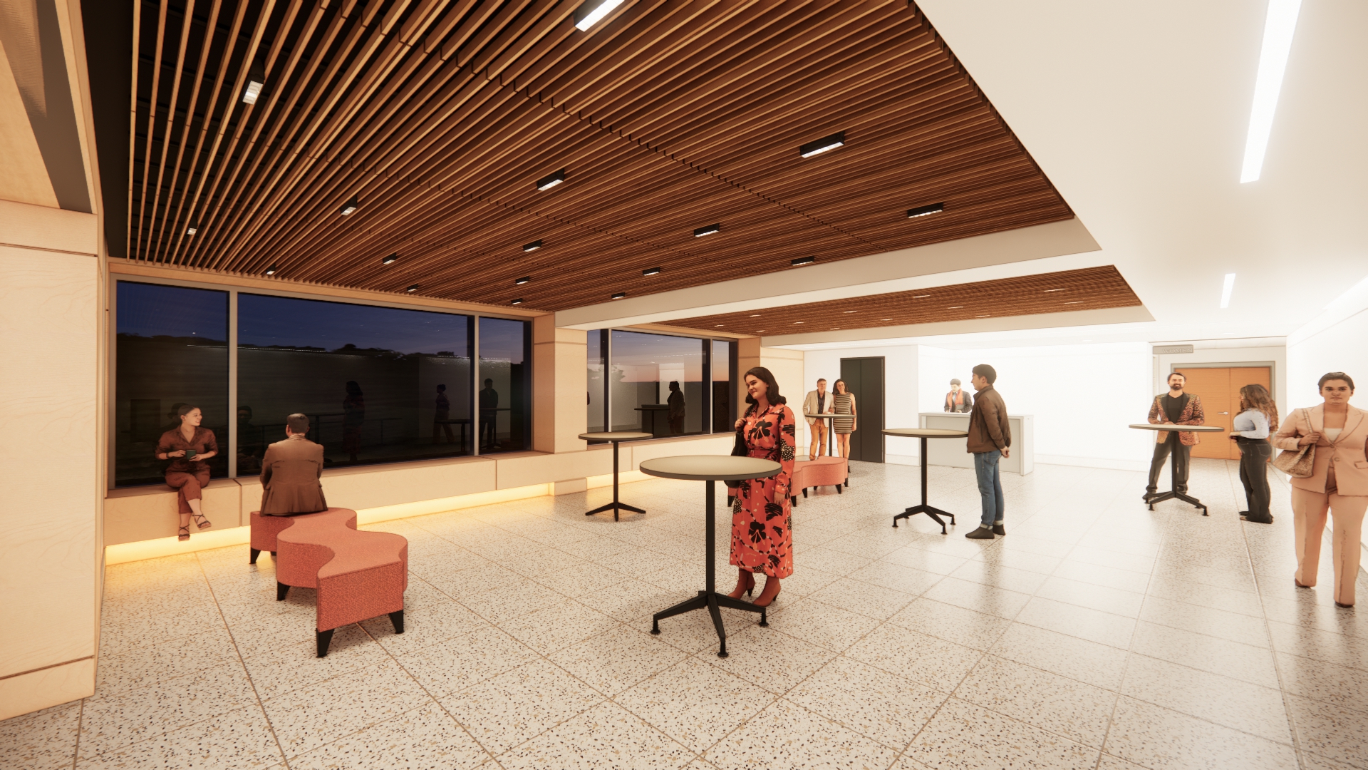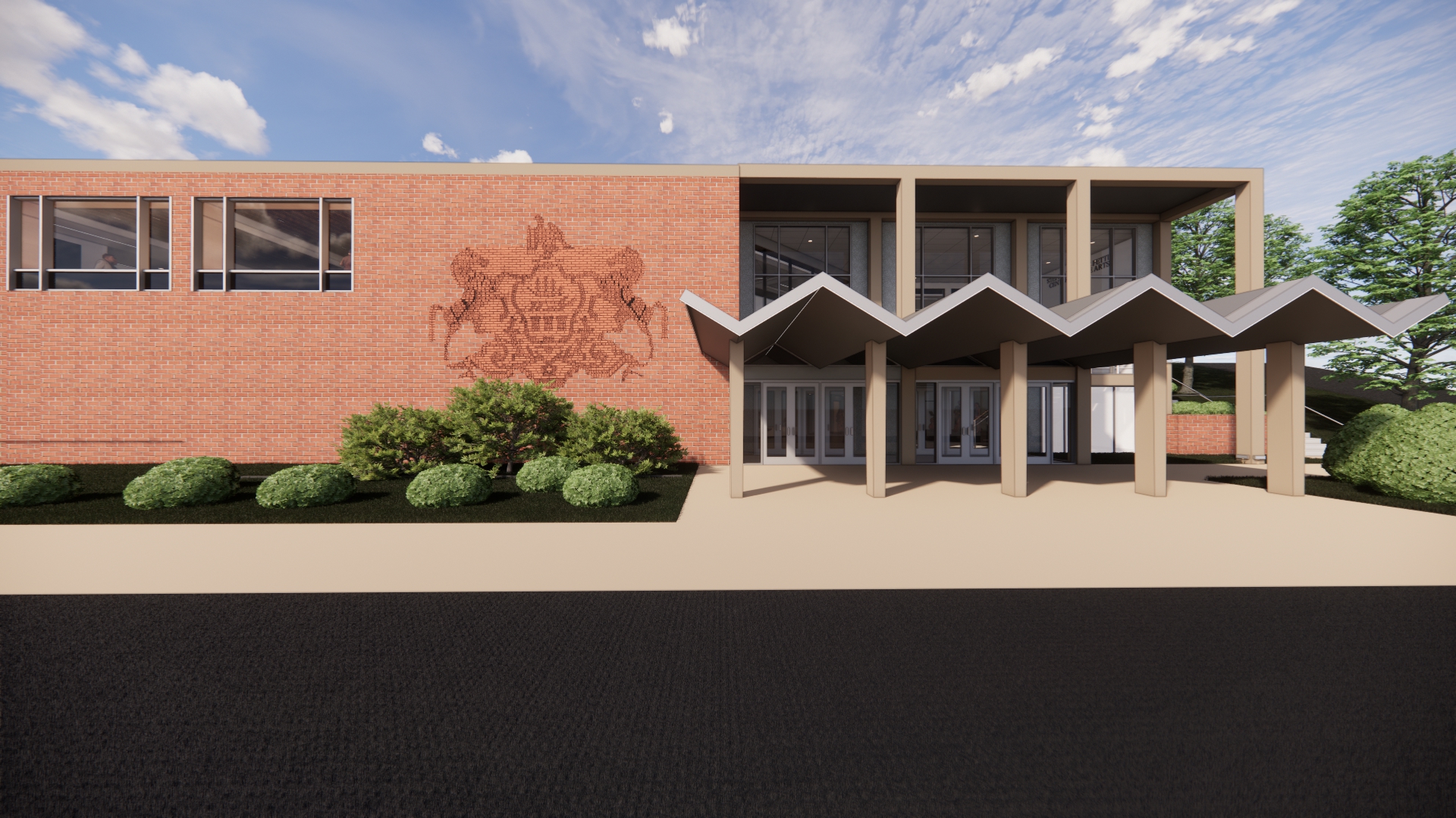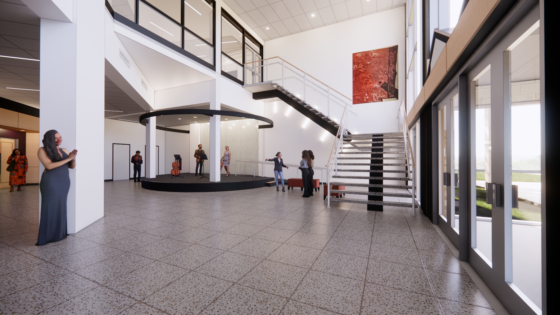 A renovation at this campus center for performing and visual arts is currently underway. The project will outfit the building to better support modern programming; elevate operability and flow for students, faculty, and visitors; incorporate new glass and select reconfiguration of spaces; address exterior masonry repairs; and reimagine interior environments through new signage and wayfinding, display and exhibit elements, and finishes, treatments, and lighting. Key focal areas include the lobby and ticket counter, art gallery, reception space, and performance auditorium to be refurbished with new theatrical controls and infrastructure, accessibility upgrades, new flooring and wall treatments, and lighting.